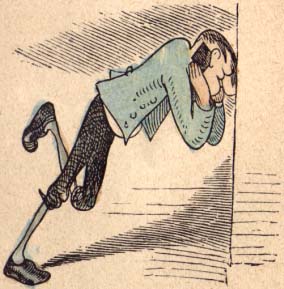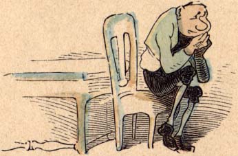 er sitzt ganz krumm und hält die Backe.